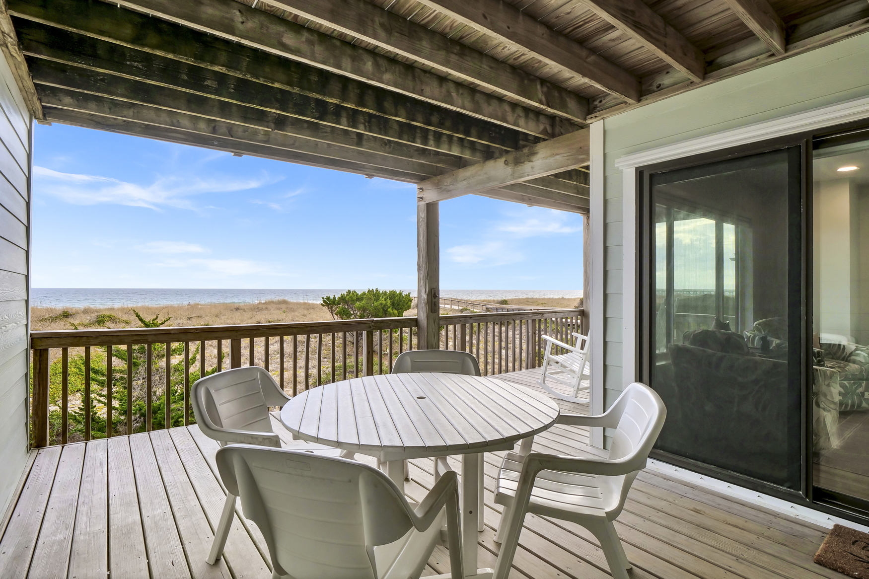 The open floorplan provides ocean views from the living, dining, and kitchen areas, with plenty of natural lighting and all new furnishings. The kitchen is fully stocked with all the comforts of home and has seating for 2 at the bar. Take in ocean views while enjoying meals together at the large dining room table or spread out in the comfortable living area to connect with family and friends. Shoot the breeze and listen to the waves crash from the large, oceanfront deck with incredible views.
