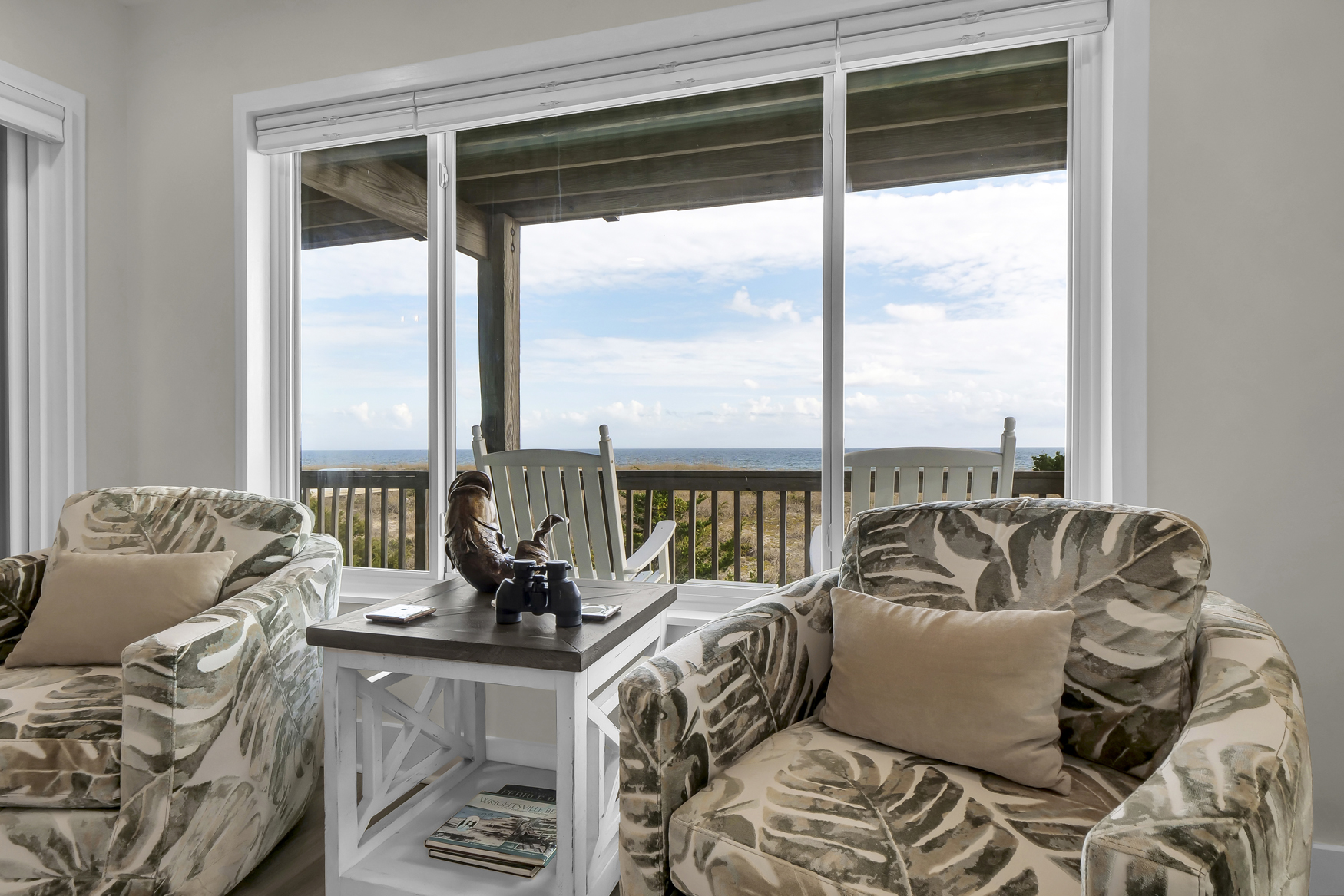 The master bedroom offers a King bed, ocean views, private full bathroom, smart TV, and direct access to the oceanfront deck. The Queen bedroom includes smart TV with streaming options and the Twin bedroom offers 2 twin beds, partial views of Banks Channel, and a smart TV. The sofa in the living room pulls out to sleep 2 more people and the full bathroom plus a laundry closet with washer and dryer are available in the hallway.