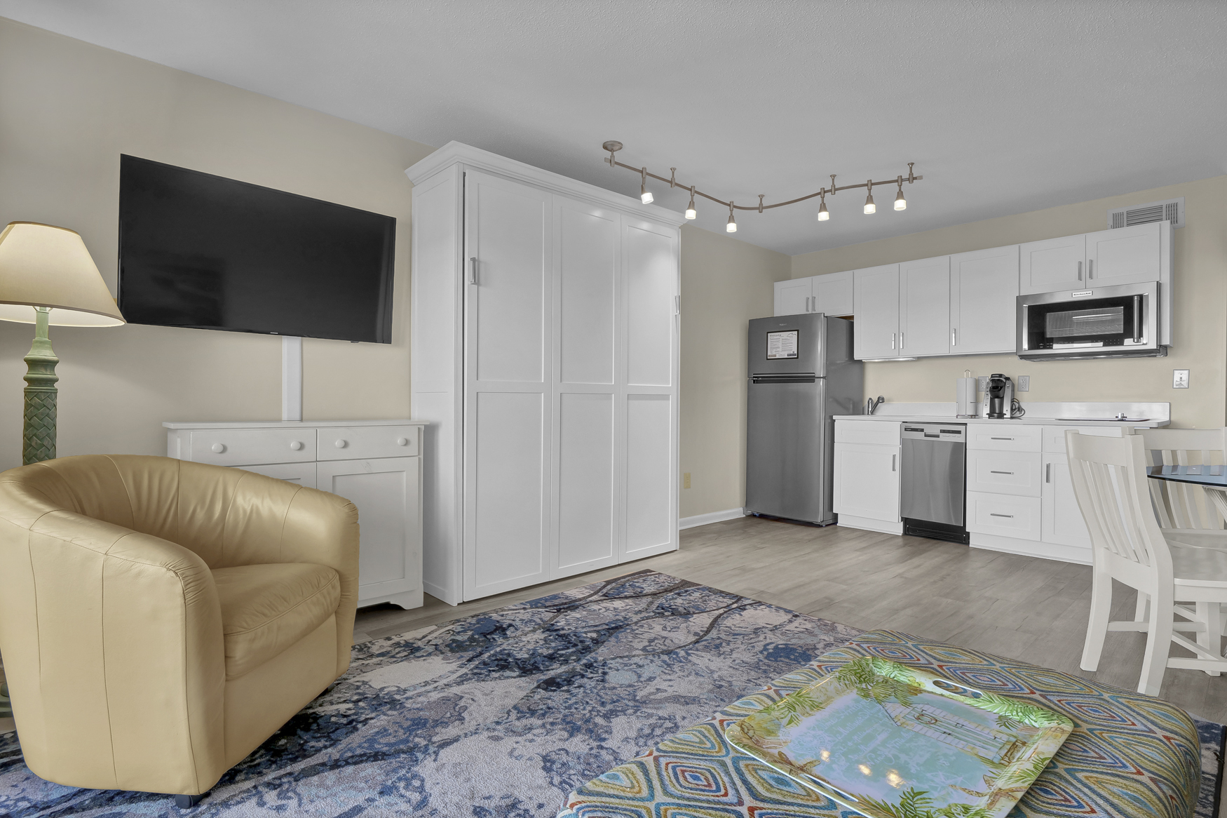 The king-size bed in the bedroom and the Murphy-style queen bed in the living room mean plenty of room to crash after a day of shredding or sunbathing. Two TVs make sure your crew doesn’t fight over the remote, and the updated kitchenette is ready for action, with a full fridge, microwave & convection oven, two-burner cooktop, dishwasher, Keurig, and even an ice maker to keep your drinks chill. Pots, pans, and all the basics are included if you’re feeling chef-y.