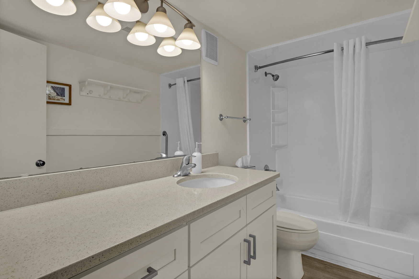 🛁 Relax in Style: The bathroom features a variety of bath amenities and a tub/shower combo with a grab bar for added safety.